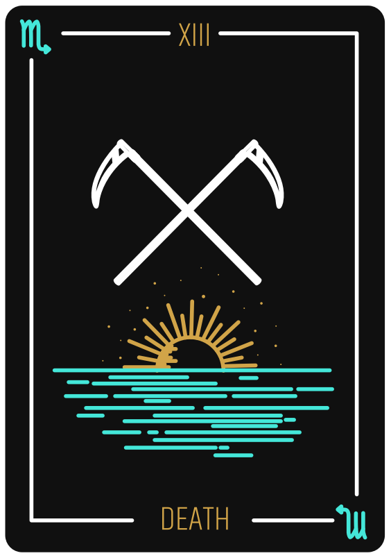 The Death card in Tarot is a card of major transformation and new beginnings, and it probably won't be easy. The Death card meaning in a Tarot reading is about transformation, passage, and change. The basic symbols of the Death card are Death as a skeleton in black robes or armor. There may also be a scythe or a flag featuring a five-petaled rose. There may be other figures in the field, the most common and recurring is that of a child.